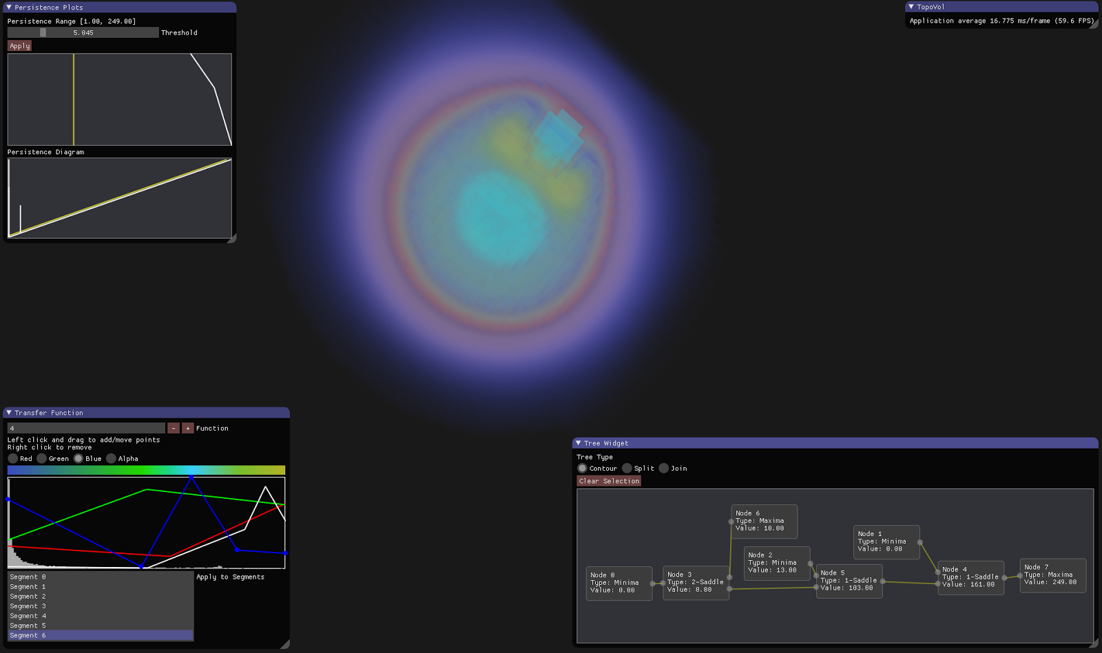 Here's an example screenshot after performing separate classification of different segments in the contour tree on the Nucleon dataset. For an example of using the system for analysis see the video of a Tooth analysis session.