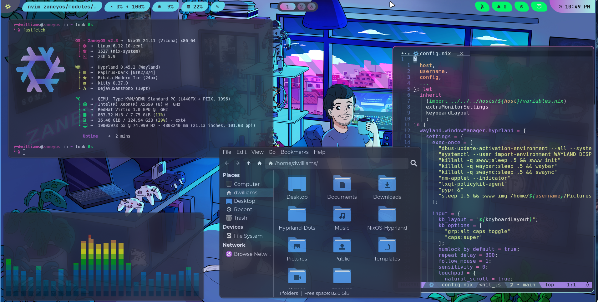ZaneyOS is a simple way of reproducing my configuration on any NixOS system. This includes the wallpaper, scripts, applications, config files, and more.