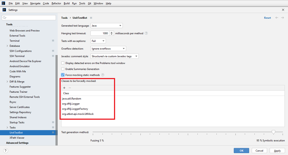 Note: currently, mocking is not available if you allocate all the test generation time for Fuzzing (see Test generation method).