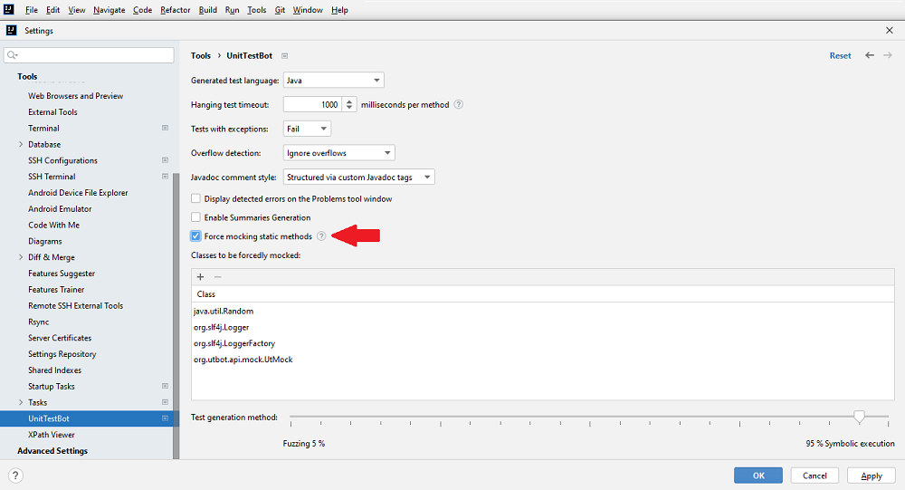 In the Generate Tests with UnitTestBot window you can choose to Mock static methods.