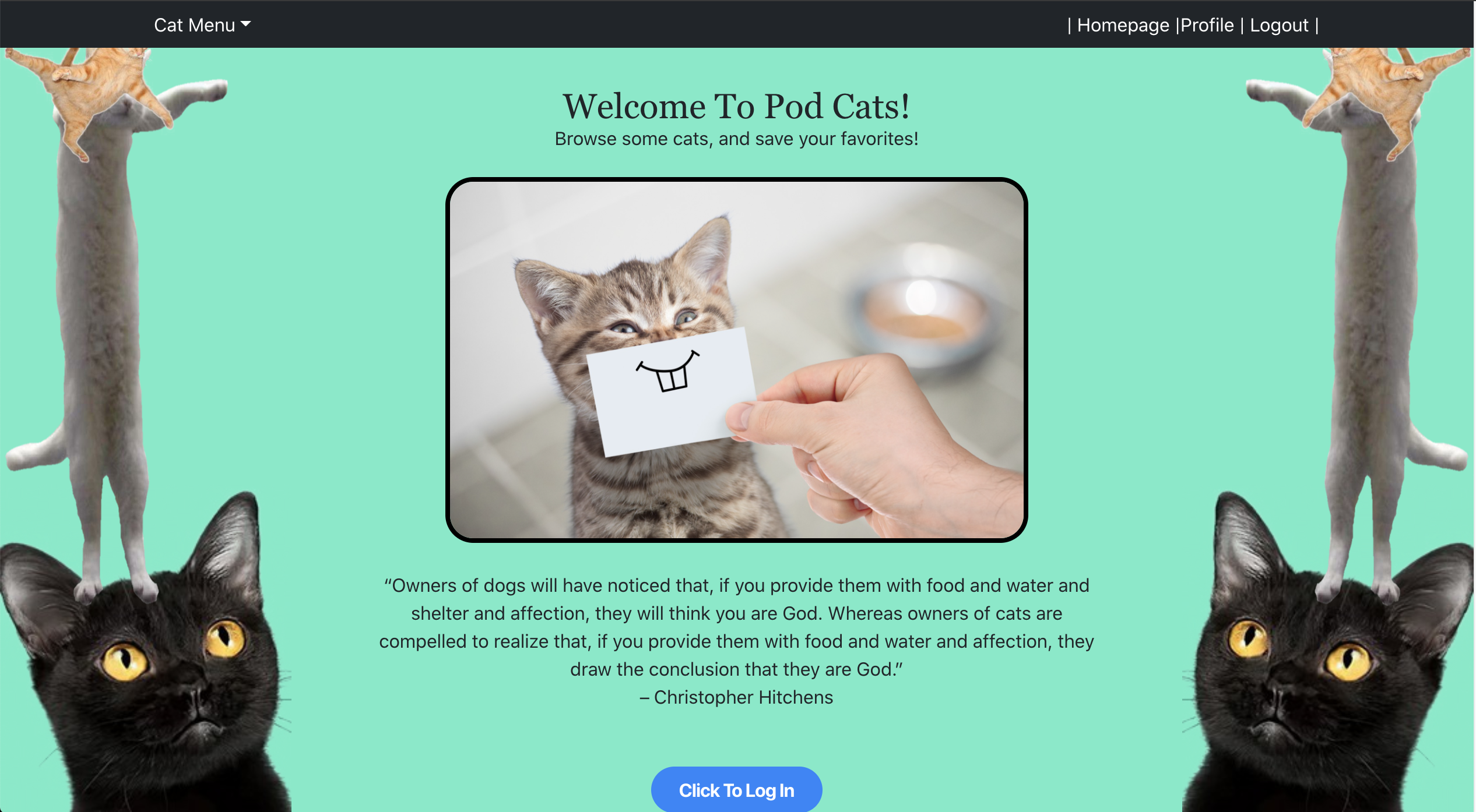 Pod Cats is a social media and educational application designed for your pet cat. This online application will allow cat owners to post and share pictures of their cute and diabolical best friend. Additionally users will be able to view posts from other cat enthusiasts.