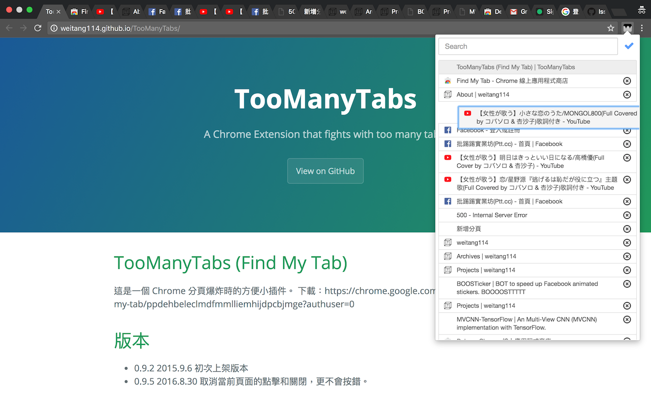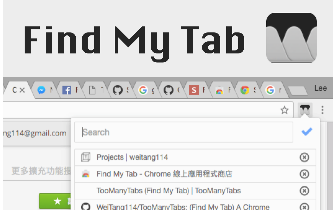 Find My Tab 是一個 Chrome 分頁爆炸時的方便小插件。啟動快速鍵:Ctrl(Cmd)-Shift-Y。