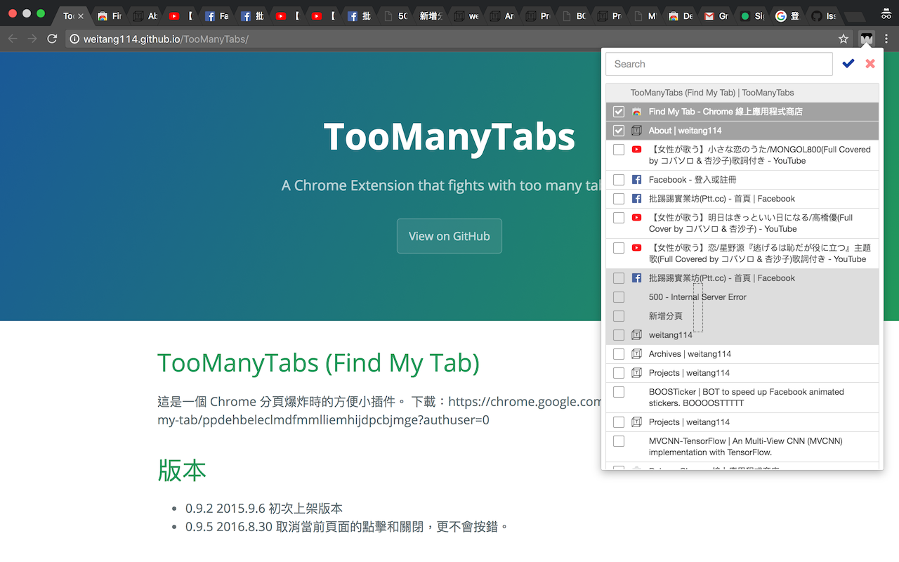- 0.9.9 2017.11.2 增加可移動 tab 和可以多選刪除 tab 的功能。改進 UI。
