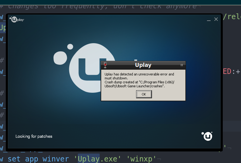 I set up a system to test this. aptli: http://ix.io/1UYd Issue still present (uplay window): Issue present with presented fix -> Assuming that winxp environment using winxp seems to resolve this Confirmed fix using Investigating to avoid using The client seems to works even with this message. Seems that NSIS ErrorReproducable: always assuming new wineprefix Current results with output https://gist.githubusercontent.com/Kreyren/97ca590d0131ed3a23b4646d2e8b8898/raw/c947adf9f99febd96623804975b8187d2a9c3a04/gagafd and popup: This seems as new issue, investigating -> Resolved