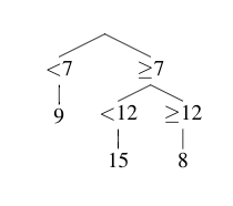 Si tuvieramos un valor x = 5 al que quisieramos ubicar, tendríamos solamente que seguir nuestro árbol. En este caso, x es mayor que 4 pero menor que y. Por tanto, sabemos que debe de caer en la zona azul. Para saber su valor en y, solo tenemos que sacar el promedio del resto de valores. Es decir: