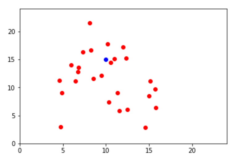 En este caso, tenemos tres categorías: azul, rojo y verde. El punto negro es un data point de clase desconocida. Si tuvieramos que clasificarlo, lo pondríamos dentro de la clase verde porque la mayoría de puntos en esta sección son verdes.