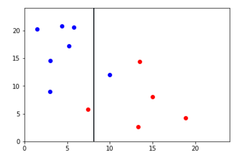 Sin necesidad de usar fórmulas podemos ver que la línea azul en el eje x fue creada a partir de una tasa de error porque se enfocó en buscar un punto en donde se encontraban la mayoría de puntos rojos y azules. Sin embargo, podemos saber que la línea roja en el eje y fue creada con un Índice Gini y redujo el ruido de todos los puntos azules arriba de y = 10.