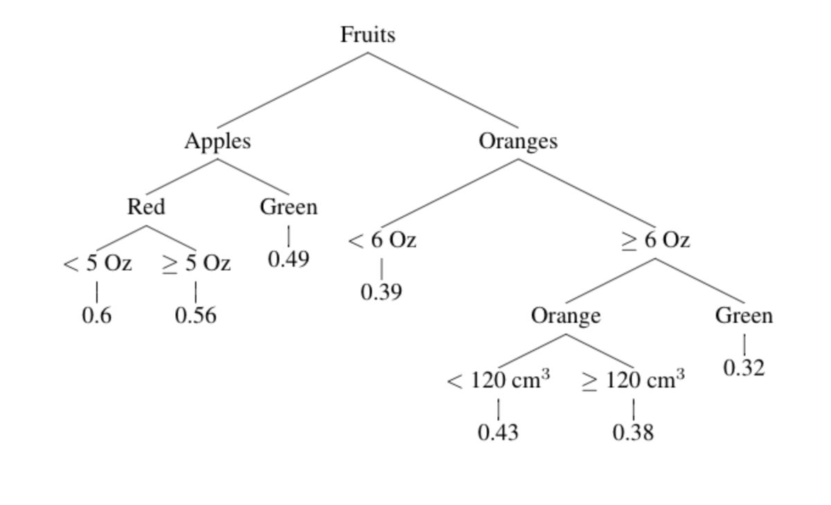 Si queremos tomar una decisión sobre la dulzura promedio de manzana roja simple que pese más de 6 onzas, sabemos que (siguiendo los árboles) el resultado es 0,35. Al seguir los caminos, podemos obtener las siguientes variables:
