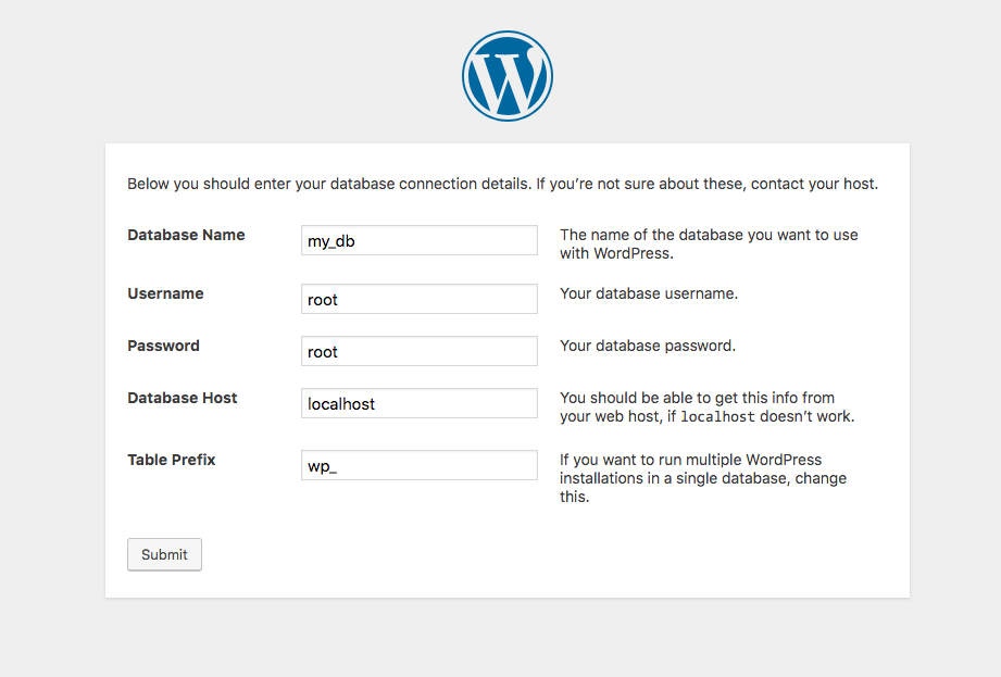 ##Give all Required Information This page requires “Database Name” (the database you’ve created earlier in Step 3). Username and Password both will be “root” as mentioned in the MAMP installation success page.