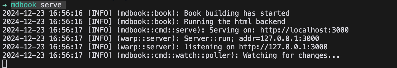 mdbook serve 注: mdbook 是基于 Rust 的一个使用Markdown 创建图书的命令行工具, 需要本地先安装命令, 详情参考官方文档: mdbook