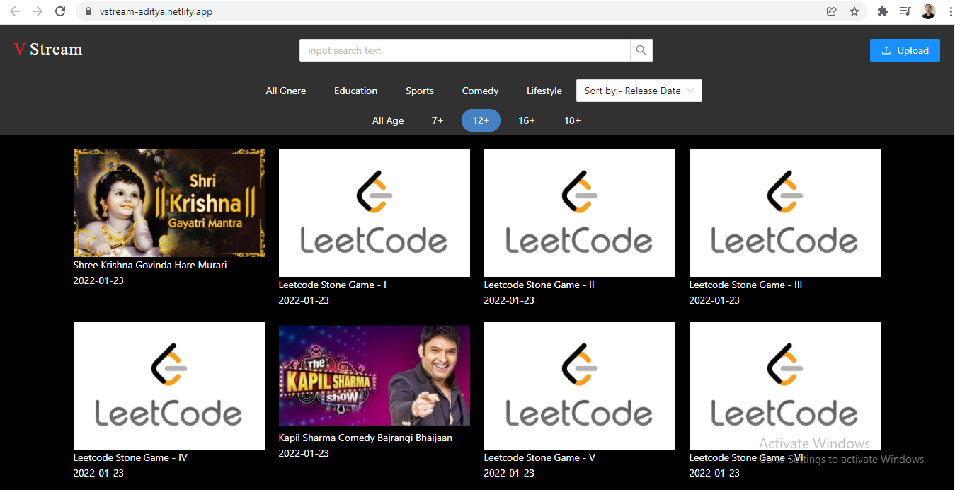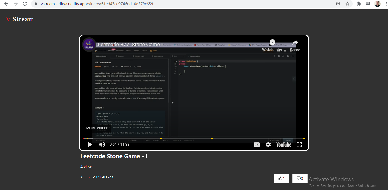 V Stream A Clone like video streaming platform Screenshots Home Page Video Page Upload Modal Authors Aditya Saha π About Me I am pre-final student from National Institute Of Technology, Agartala Demo https://vstream-aditya.netlify.app/ π Skills Used HTML, CSS, Javascript, React Js, Node Js, Mongodb and Moongoose