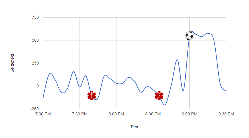 In this project, I scraped tweets during the Settle Reign v Chicago Red Stars game on 7/14/18. Keywords included the team names, player names, and the game hashtag. I collected the sentiment of each tweet and collected them into buckets. Below is the resulting graph that compared the sentiment during the game, to in-game events. During the game there were two serious injuries where sentiment was very negative, and then a huge jump in sentiment during the lone goal.