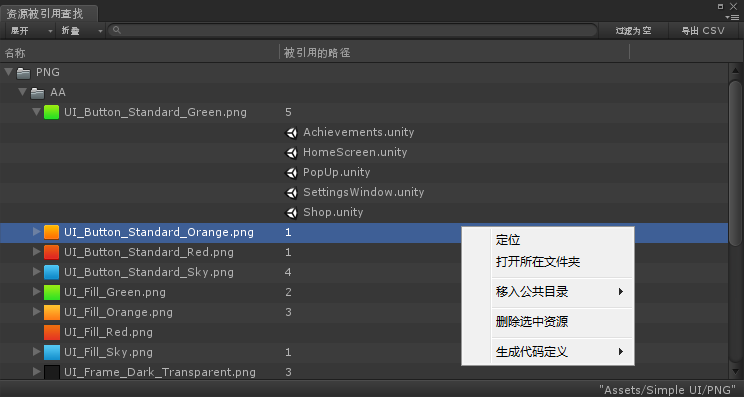 public static void DisplayDuplicateWindow(string refPaths, string resPaths, string commonPaths = "")示例工程举例实现右键资源文件来查看被引用情况。