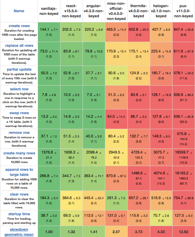 Below are the render steps for the other libraries compared, which shows that Pux is the only one that has an intermediate virtual DOM representation (it has to render to React first then React has to render):