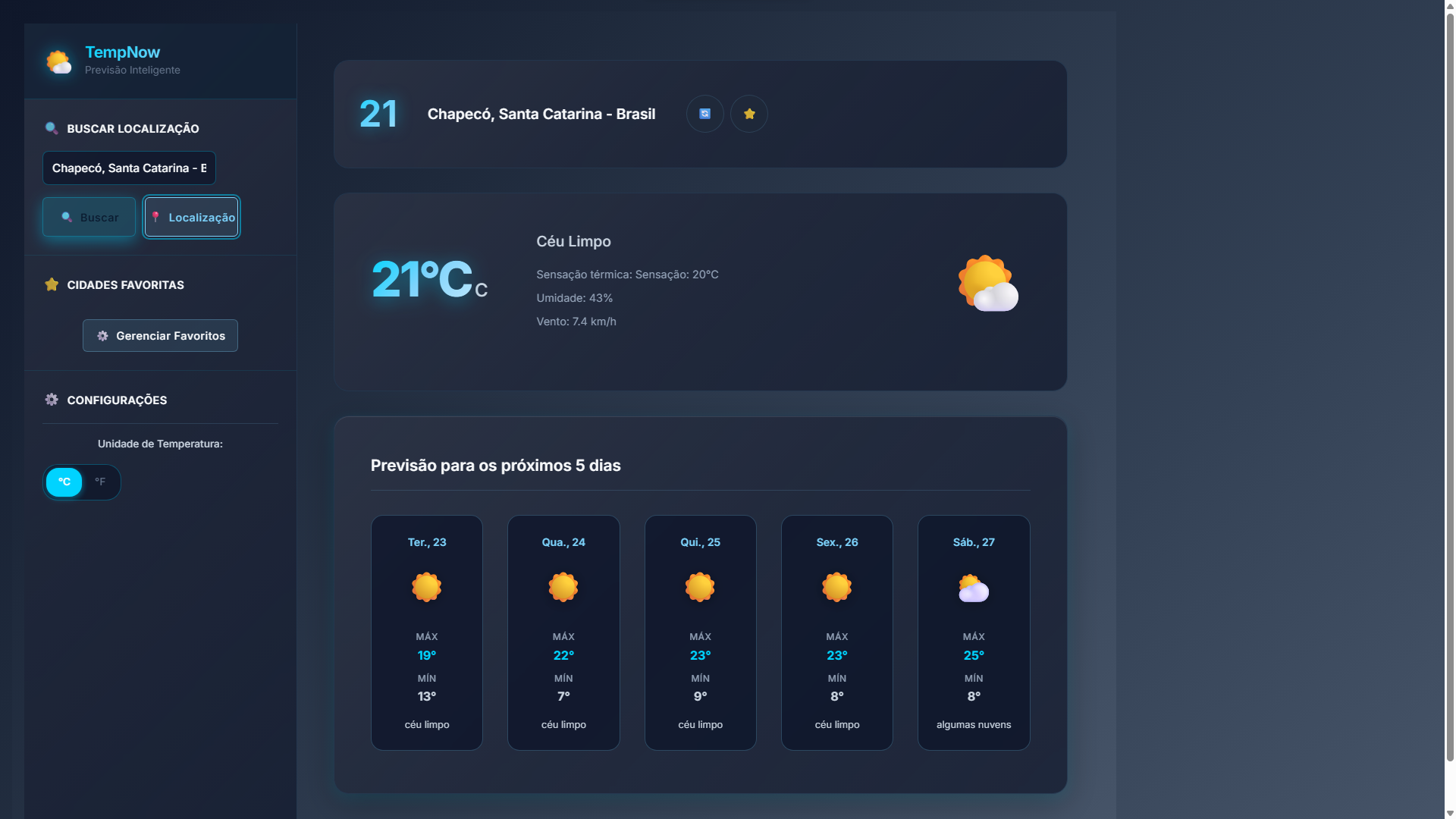 Aplicação web responsiva de previsão do tempo desenvolvida com HTML5, CSS3 e JavaScript, integrada à API OpenWeather. Permite busca por cidades, exibe condições climáticas em tempo real e previsão estendida, com interface moderna e intuitiva para uma experiência fluida de UI/UX.