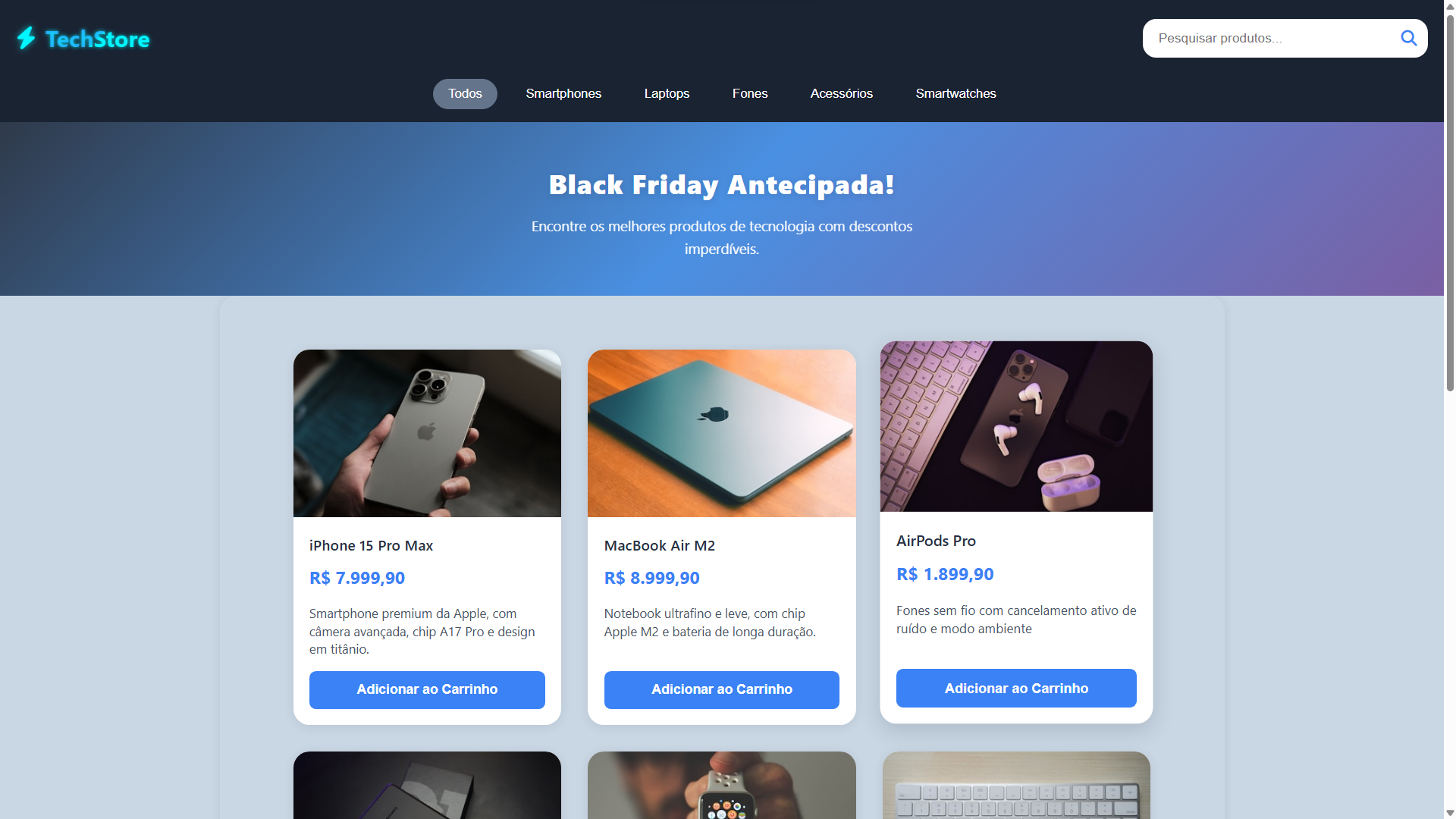 Projeto de loja virtual desenvolvido para simular a compra de produtos de tecnologia. Conta com catálogo de produtos, carrinho de compras e interface responsiva, oferecendo uma experiência prática e intuitiva para o usuário.