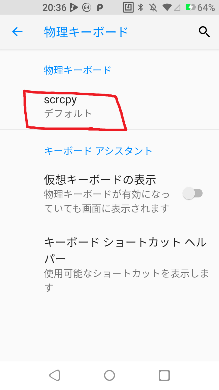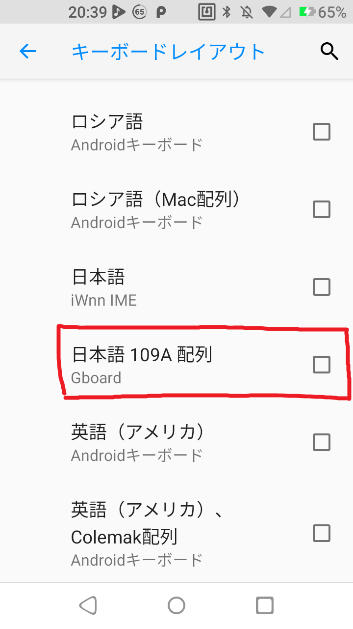 - デバイスの設定->システム->言語と入力->物理デバイス