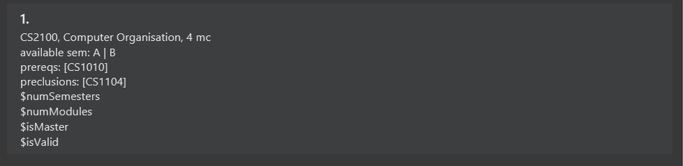 After entering info command for CS2100, there are several fields which do not look correct (the bottom 4). This is also shown in the UG, but it looks like it might be due to unimplemented features, and their purpose is unclear.
