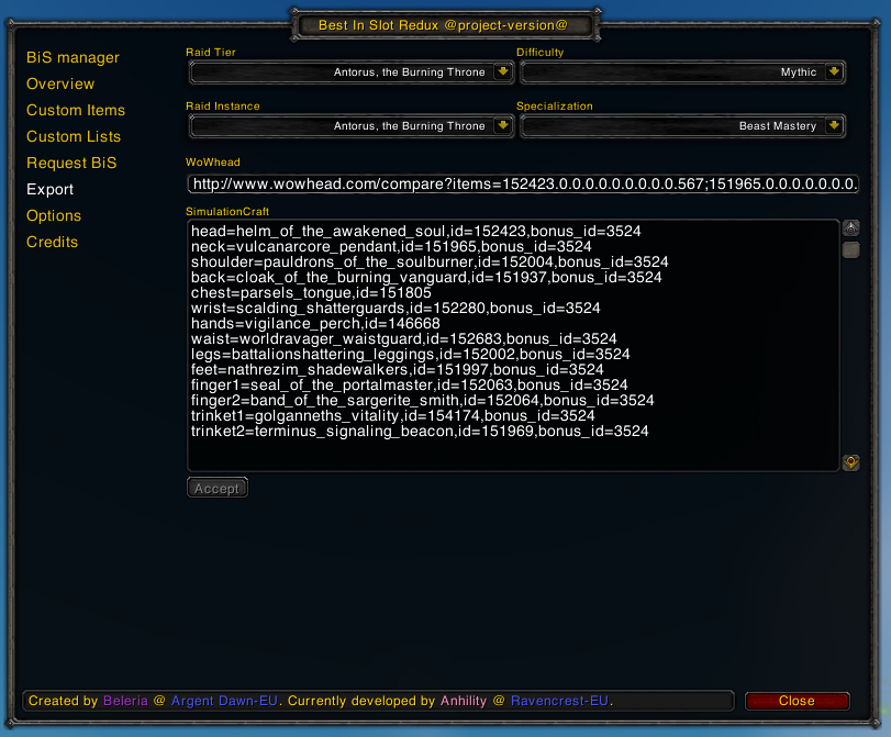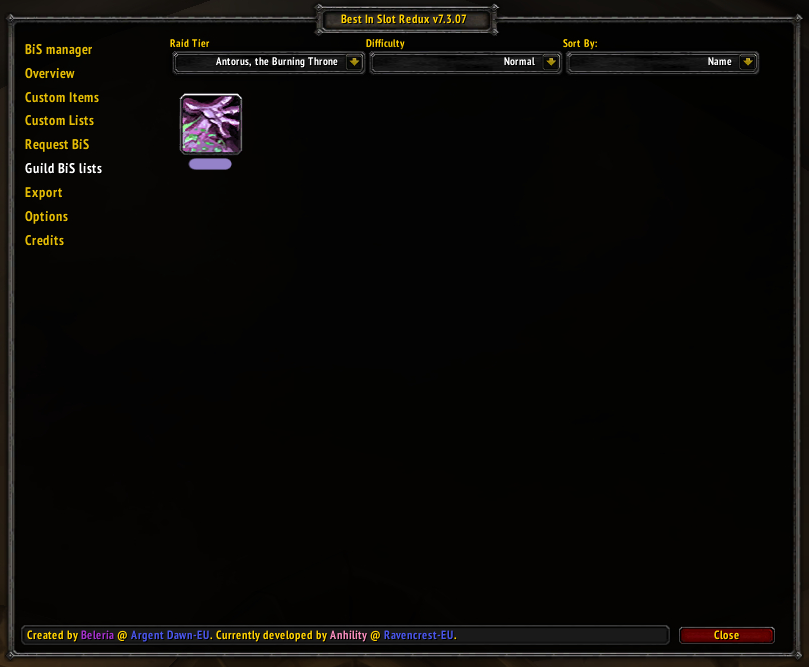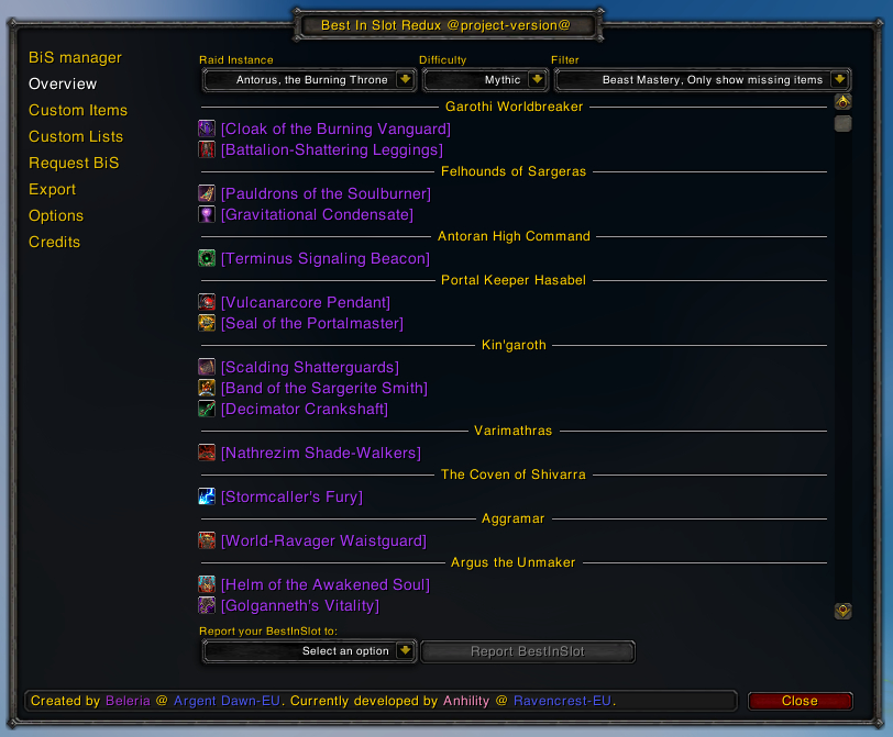 The BiS Manager is where all the magic happens. This is the place where you can set your BestInSlot lists. On startup the AddOn automatically selects the highest available raid tier and difficulty. You can make a BestInSlot list for every raid tier, for every difficulty, for every specialization. For instance, a hunter can have 3 specializations for Mythic Antorus, the Burning Throne: one for Beast Mastery, Marksmanship and Survival.