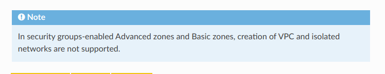 "In security groups-enabled Advanced zones and Basic zones, creation of VPC and isolated networks are not supported."