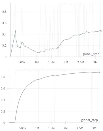 Figure 2: In the upper image, we assess performance on a larger task (of size 15x15), while in the lower image, we evaluate performance on an easier task (of size 9x9). These particular tasks are instances of a SimpleCrossing gridworld environment. Both tasks are integrated into a single environment, with an emphasis on oversampling the harder task. Despite a certain degree of knowledge transfer from the smaller to the larger task, and the oversampling of the larger task, the learning performance on the larger task remains signicantly inferior to that of the smaller task.