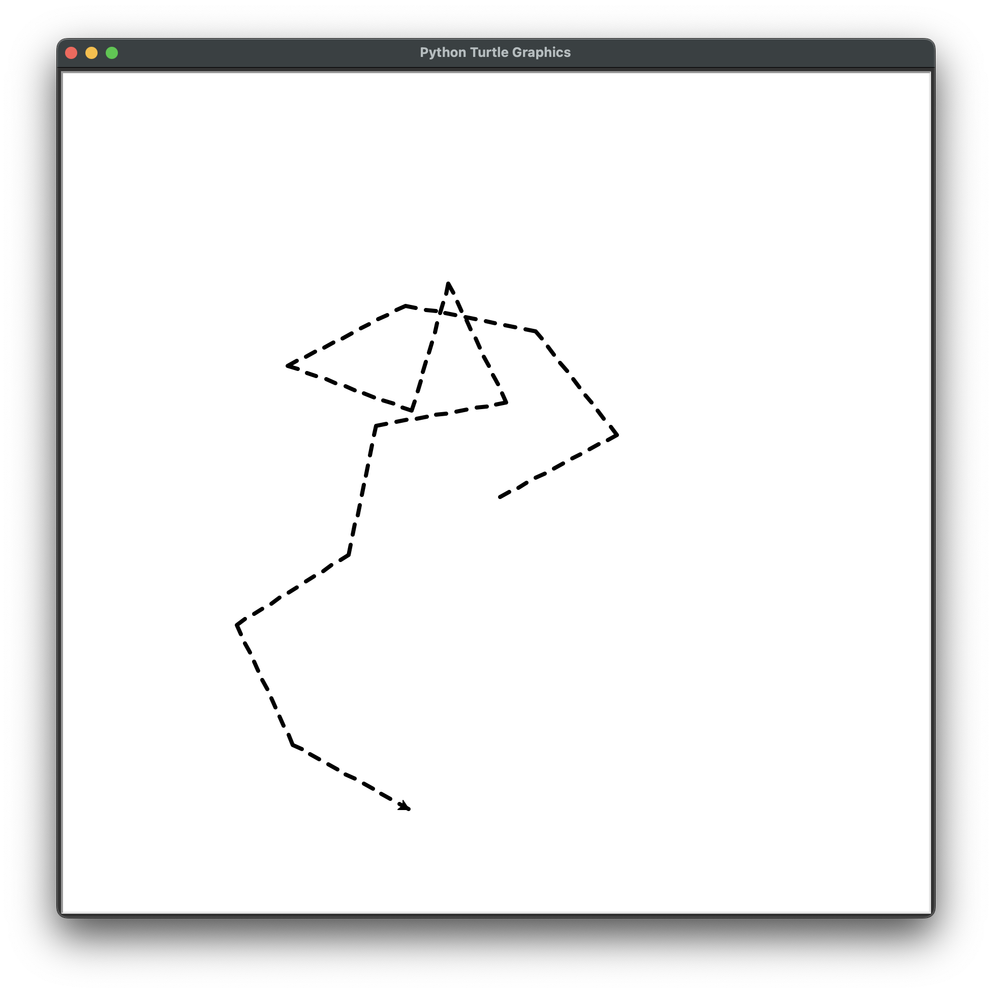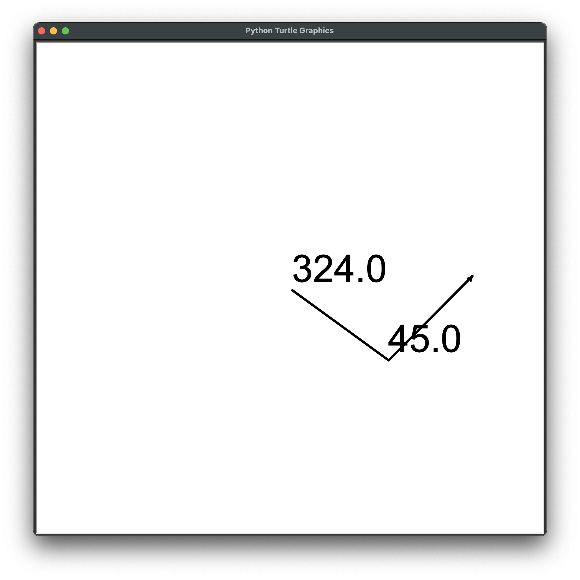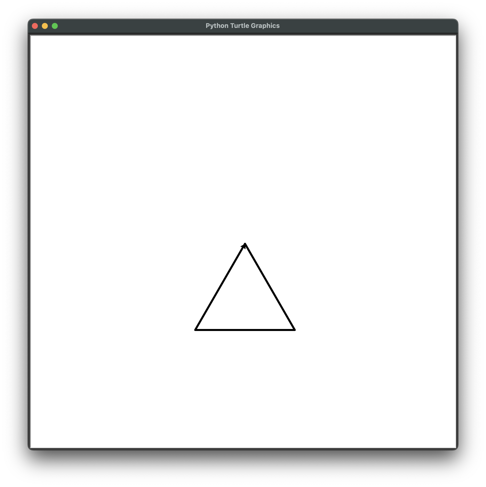 In the Turtle window, the turtle appears as a triangle. Imagine the turtle is holding a pen on the ground and drawing as it moves. The Python code tells it how to move: