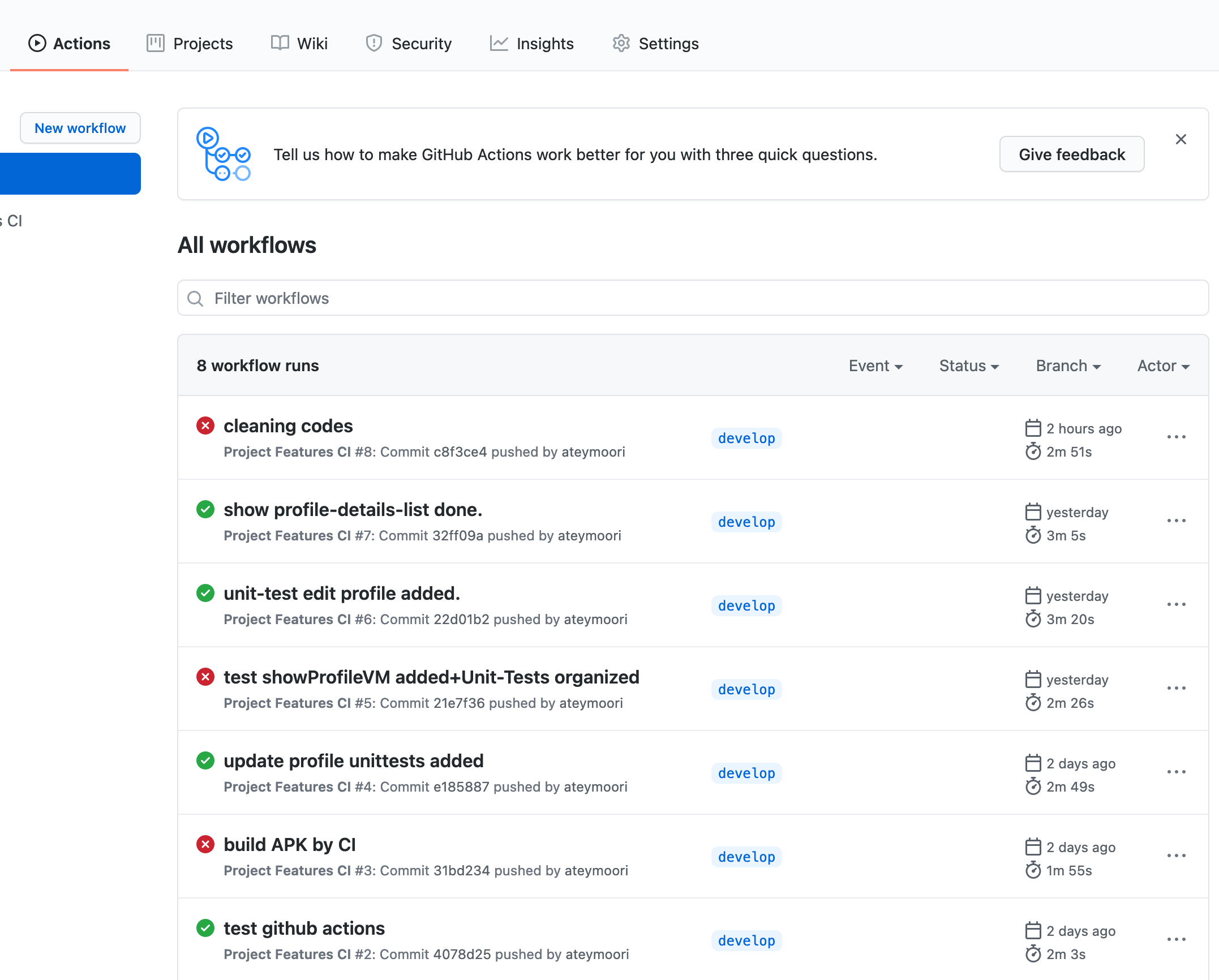 }Also I'm using GitHub Actions as CI/CD. As I defined before, If I push the codes into any branch except master/release, All tests will run, Then If all of them passed, one APK will be built and uploads into the Github actions artifact.