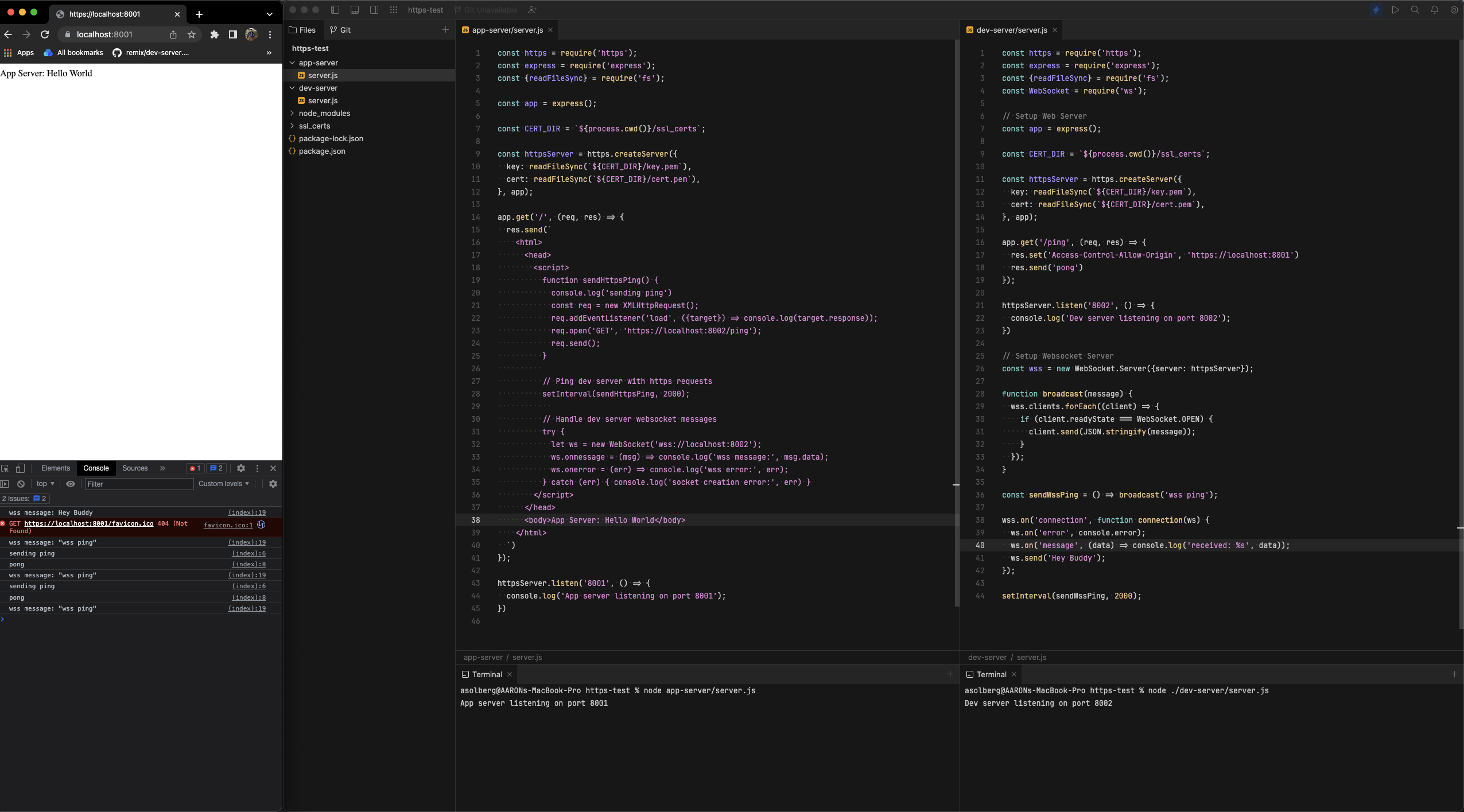 Then visit https://localhost:8001 and you should see sending ping,pong for the https