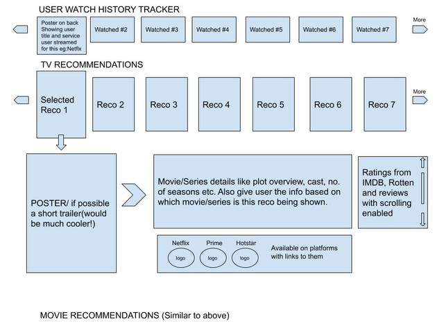 - When a User clicks a poster in any section, the extension should redirect user to a new webpage in the new tab. This webpage would contain all the user data such as watch history, recos data and primarily fetch more data about each reco like plot, cast, reviews and add links to the platforms that stream this particluar reco. The desired webpage would look like this :