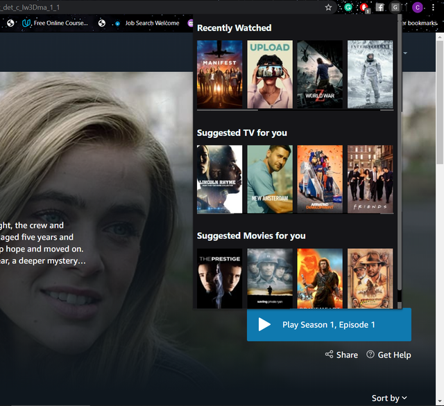 This is a browser extension that tracks User's watch history and recommends movie and TV Series. This extension scrapes the titles from the Netflix video player and prime after verifying whether the User has watched a particular movie/Tv show. Then it stores all the watch history in local storage and makes the calls for TMDB API for recommendations, then picks the top 5 titles. It also avoids redundant recommendations and display these recos in three sections : recently watched, TV suggestions, Movie suggestions. All the sections are horizontally scrollable. The extension looks like this as of now :