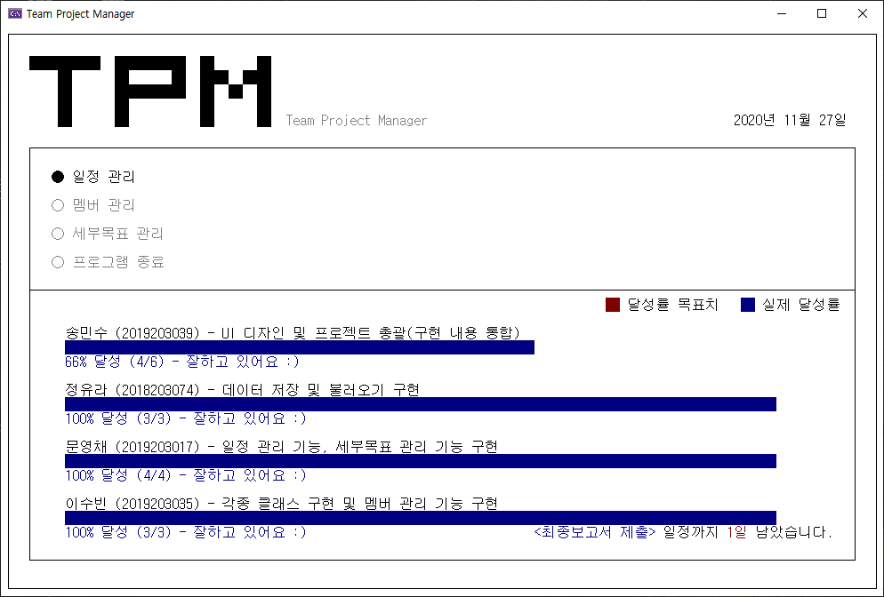 - 각 멤버의 세부목표 달성률이 메인화면에 그래프로 표시됩니다.