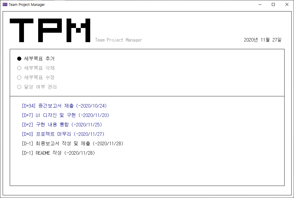 'Team Project Manager' 는 광운대학교 오픈소스 소프트웨어 개발 수업의 14조 팀프로젝트 과제로 개발된 프로젝트 관리 소프트웨어 입니다. 프로젝트의 일정, 팀 멤버, 세부목표 등을 설정하고 관리할 수 있습니다. 자세한 내용은 아래를 참고해 주시길 바랍니다.