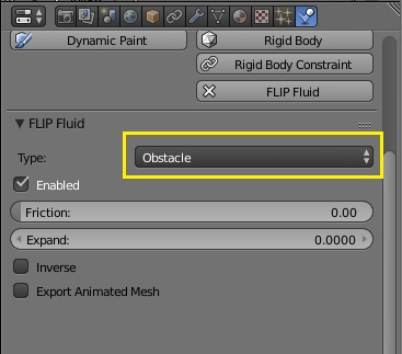 - Similarly to how we created the Inflow, we will select the icosphere object and then click the OpenFLIP button. This time, instead of setting the type as Inflow, we will set the Type to Obstacle. The physics panel will now contain settings to configure the obstacle object. We will just leave these settings as is.