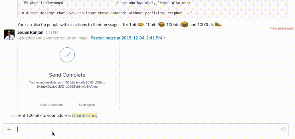 Slack Tipbot was created during the Coinbase hackathon in early December 2015. If you're interested in learning more about working at Coinbase send us a note. We'd like the world to have an open payment network.