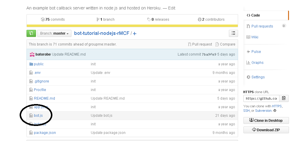 Sign into Github, go to this link https://github.com/batorobe/bot-tutorial-nodejs-rMCF, and click the 'Fork' button in the upper right corner