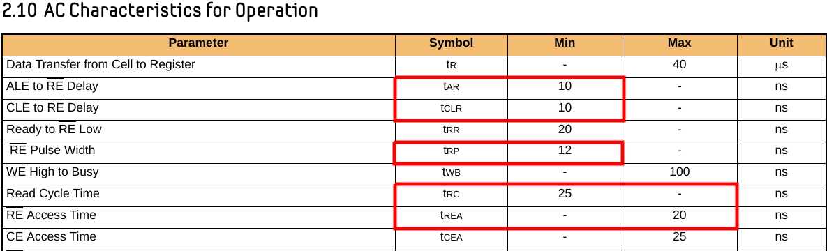 - tAR - Address Latch Enable (ALE) to Read Enable (RE) delay (ns).