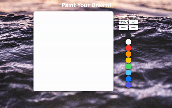 This clone is a mock-up of Window paint brush, made with MDN Canvas API. Main features are drawing, filling, erasing and reseting, all of which are interactive with the colors off of the buttons.