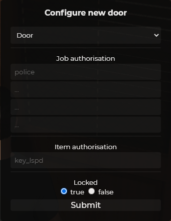 Set multiple jobs to be authorised to use a door, with the minimum required gradeauthorizedJobs = {['police']=0, ['offpolice']=0}