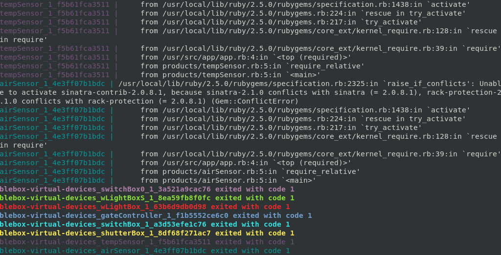 from products/switchBox0.rb:5:in<main>' Successfully installed sinatra-2.1.0 1 gem installed Warning: the running version of Bundler (1.16.1) is older than the version that created the lockfile (1.17.3). We suggest you upgrade to the latest version of Bundler by runninggem install bundler. Using backports 3.17.0 Using bundler 1.16.1 Using multi_json 1.14.1 Using ruby2_keywords 0.0.2 Using mustermann 1.1.1 Using rack 2.2.2 Using rack-protection 2.0.8.1 Using tilt 2.0.10 Using sinatra 2.0.8.1 Using sinatra-contrib 2.0.8.1 Bundle complete! 3 Gemfile dependencies, 10 gems now installed. Gems in the groups development and test were not installed. Bundled gems are installed into/usr/local/bundle/usr/local/lib/ruby/2.5.0/rubygems/specification.rb:2325:inraise_if_conflicts': Unable to activate sinatra-contrib-2.0.8.1, because sinatra-2.1.0 conflicts with sinatra (= 2.0.8.1), rack-protection-2.1.0 conflicts with rack-protection (= 2.0.8.1) (Gem::ConflictError)