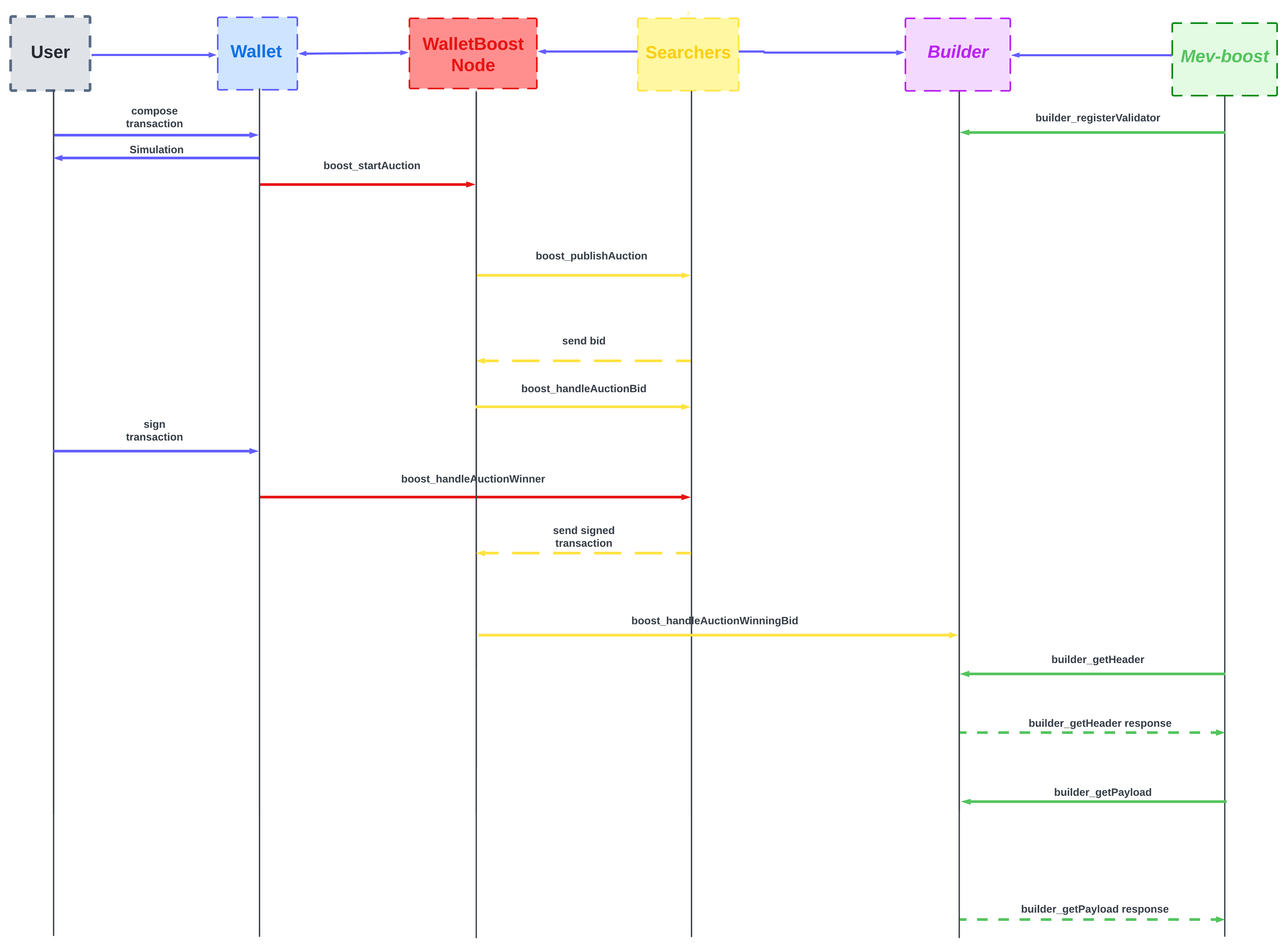 Many wallets today simulate their user’s transactions before they sign and submit it to the network. The user will construct their desired transaction and the wallet will simulate the transaction against current block state, relaying the exact outcome (ie. net balance changes) of the desired transaction back to the user. The time between constructing the transaction and receiving the simulated result is known as the ‘intent layer’. Wallet-Boost intends to start the auction flow at the intent layer. The primary flow will consider five main events: