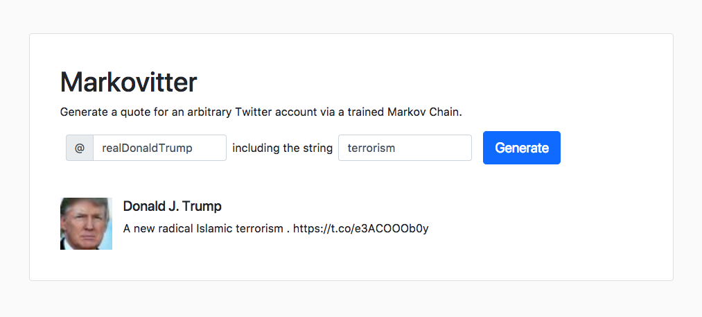 markovitter Generate quotes for an arbitrary Twitter account via a trained Markov Chain. Development $ docker-compose down --volumes $ docker-compose up --build