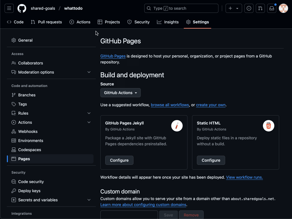 В настройках проекта (Settings) зайти в раздел Pages (Страницы) и выбрать публикацию этих страниц с помощью автоматизированных процессов – «Deploy Github Actions».