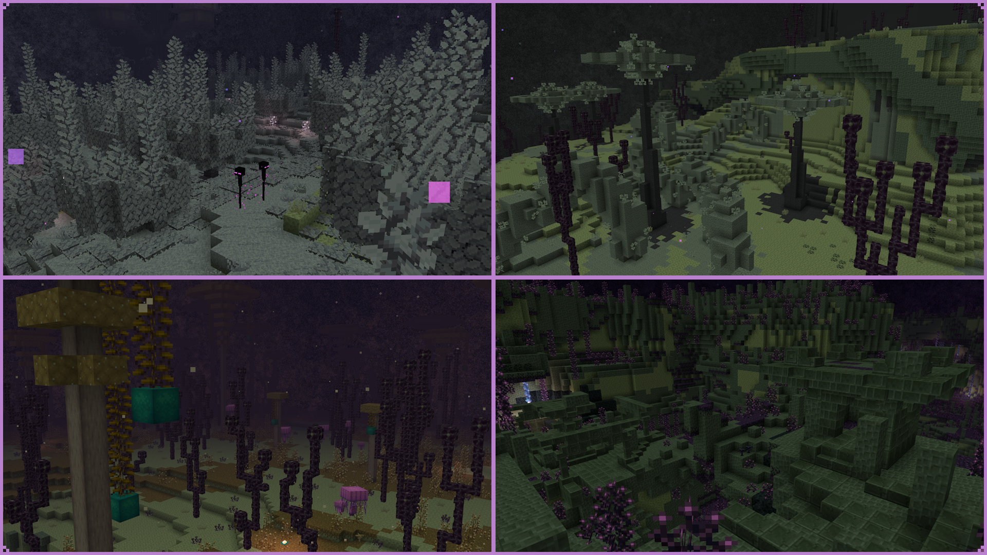 Enderscape is a total overhaul of the End dimension, featuring new world generation, four new biomes, revamped End Cities, and many other additions that enrich the End- and all that lies beyond.
