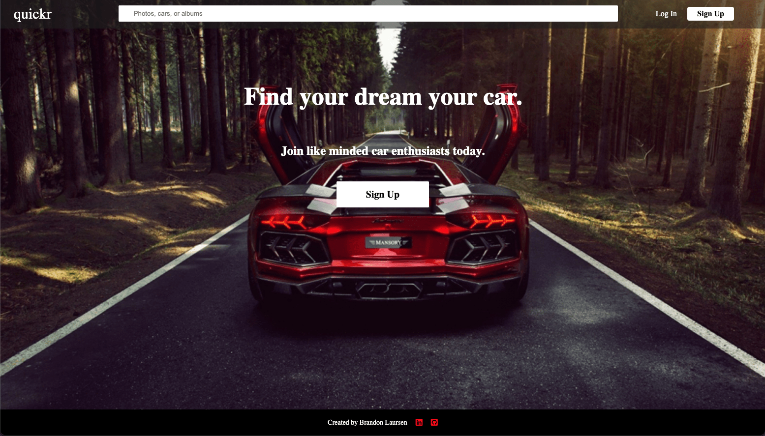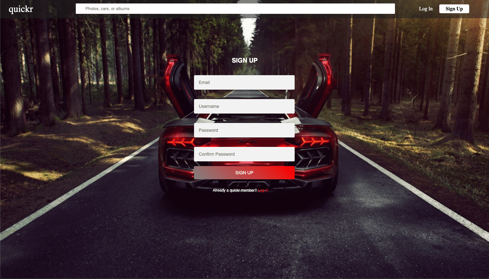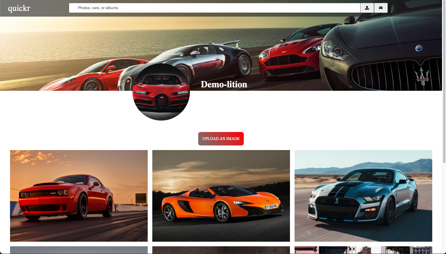 quickr is a clone of the classic flickr, but with a focus on sports cars. Where as flickr is used for all photos, quickr is used for car enthusiast to show their passion for cars. Users will be able to interact with other users who share the same passion by creating albums and uploading pictures. Users will be able to create their own profiles, leave comments, and create their own showroom full of their favorite cars.