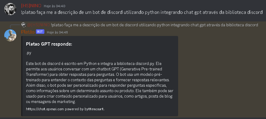Este bot de discord é escrito em Python e integra a biblioteca discord.py. Ele permite aos usuários conversar com um chatbot GPT (Generative Pre-trained Transformer) para obter respostas para perguntas. O bot usa um modelo pré-treinado para entender o contexto das perguntas e fornecer respostas relevantes. Além disso, o bot pode ser personalizado para responder perguntas específicas, como informações sobre um determinado assunto ou produto. Ele também pode ser usado para criar conteúdo personalizado para usuários, como artigos, posts de blog ou mensagens de marketing. incluindo esta descrição.