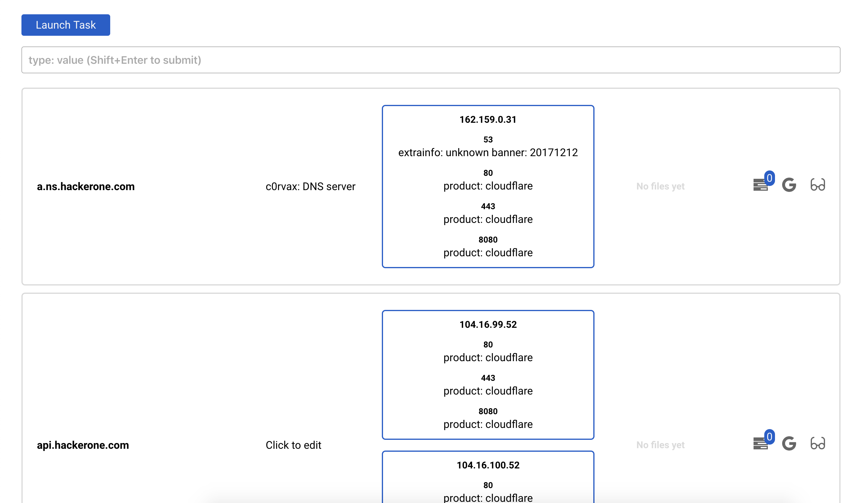 This would launch amass -d hackerone.com -ip. Note that in this case we did not specify any domain. This is beacause the All_top_level_domains check box means looking into the scope which is stored in the database. So the program sees that hackerone.com was added to the scope and launches amass against it.