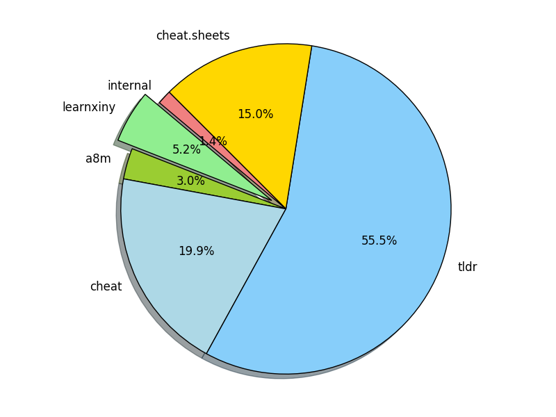 Pie diagram reflecting cheat sheets sources distribution (by number of cheat sheets on cheat.sh originating from a repository):