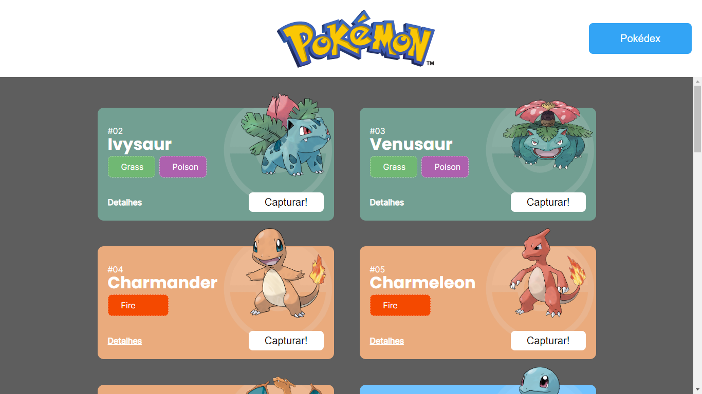- Home: o usuário deve receber uma lista de pokemons vinda da API. Ele pode armazenar Pokemons em sua Pokedex clicando em cada um.