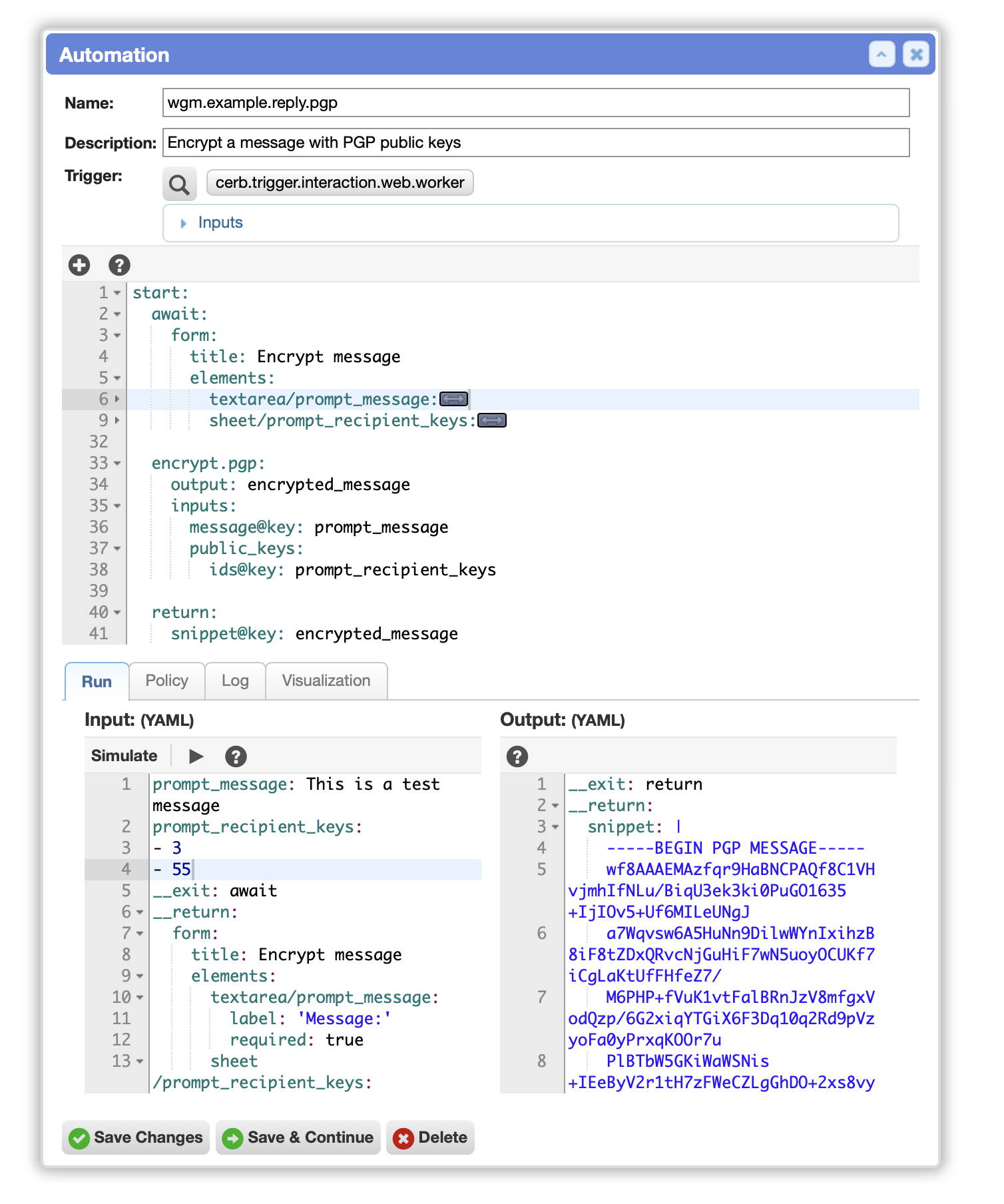 Interactions also receive the currently selected text as input, so you could add another interaction to decrypt the encrypted PGP messages you receive. The automation could determine which workers are allowed to use which decryption keys.