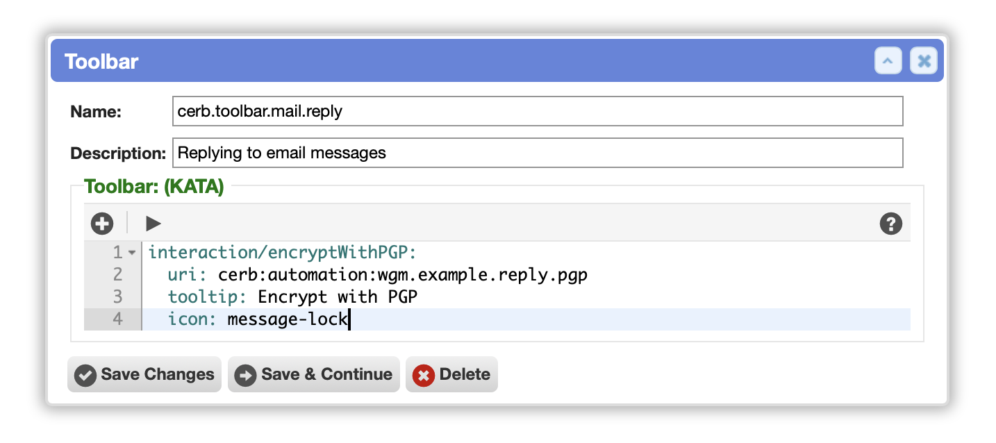 mail.replytoolbar to add our encryption interaction as a button:This is using toolbar KATA, but you can generate the entire script using the (+) button, which opens another built-in interaction to guide you (notice the trend?).